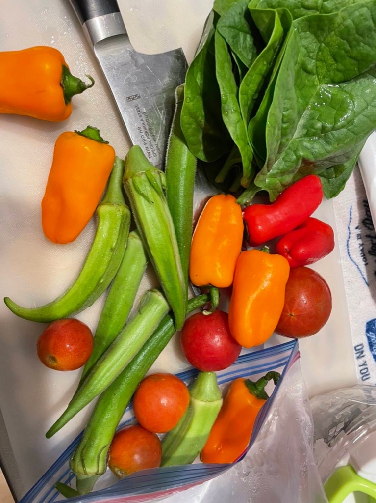 ツルムラサキ(白と赤)、パプリカみたいの、さつまいも2種類、